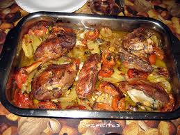 En una bandeja de horno ponemos todo junto con las patatas cortadas a lo largo y un poco gruesas y los piñones y lo metemos en el horno precalentado a 250 grados durante 20 minutos. Cuando ha pasado este tiempo lo bajamos a 180 grados hasta completar una hora.